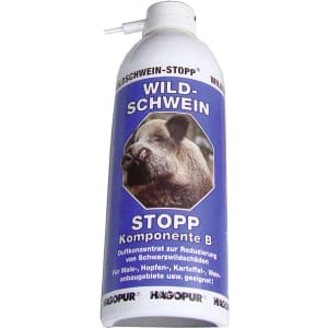 Beim Abwehrmittel "Wildschwein Stopp" von Hagopur® handelt es sich um ein intensives Duftkonzentrat zur Reduzierung von Schwarzwildschäden in Mais-, Wein- und Kartoffelanbaugebieten sowie Naturgrundstücken, Gärten und im Straßenverkehr.
